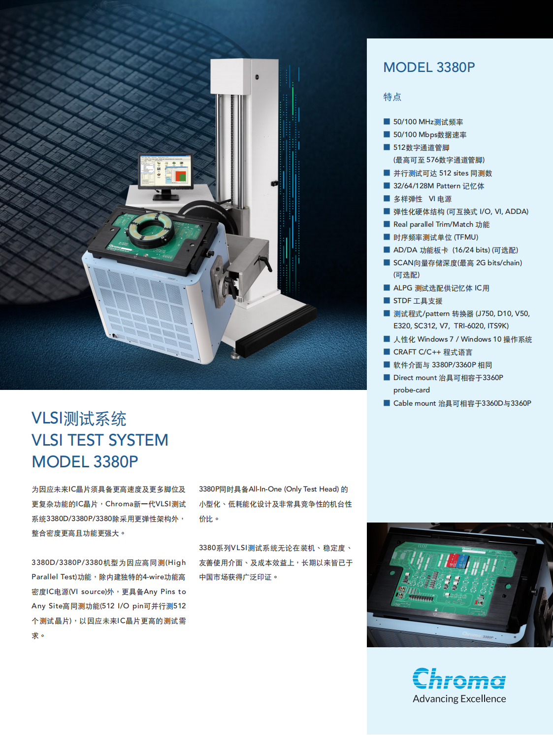 为因应未来IC晶片须具备更高速度及更多脚位及更复杂功能的IC晶片,Chroma新一代VLSI测试系统3380D/3380P/3380除采用更弹性架构外,整合密度更高且功能更强大。